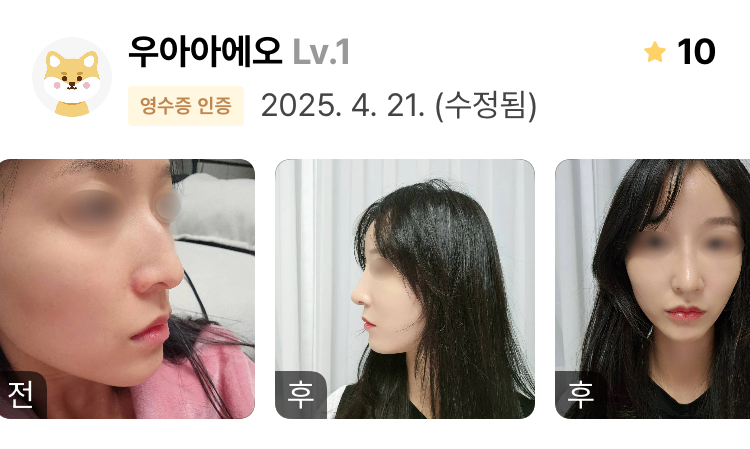 긴코교정 복코교정 하면서 콧대교정도 같이 들어가고 절골을 하고 낮아진 코에는 실리콘을 넣어서 높이를 맞췄어요