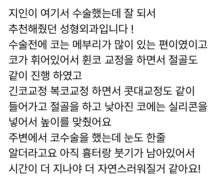 주변에서 코수술을 했는데 눈도 한줄 알더라고요 아직 흉터랑 붓기가 남아있어서 시간이 더 지나야 더 자연스러워질거 같아요!