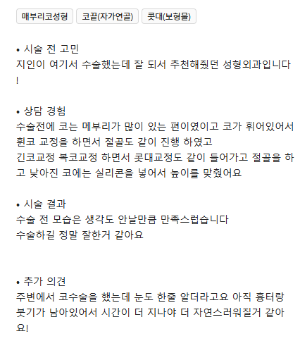 • 시술 전 고민 지인이 여기서 수술했는데 잘 돼서 추천해줬던 성형외과입니다 ! • 상담 경험 수술전에 코는 메부리가 많이 있는 편이였이고 코가 휘어있어서 휜코 교정을 하면서 절골도 같이 진행 하였고 긴코교정 복코교정 하면서 콧대교정도 같이 들어가고 절골을 하고 낮아진 코에는 실리콘을 넣어서 높이를 맞췄어요 • 시술 결과 수술 전 모습은 생각도 안 날만큼 만족스럽습니다 수술하길 정말 잘한 거 같아요 • 추가 의견 주변에서 코수술을 했는데 눈도 한 줄 알더라고요 아직 흉터랑 붓기가 남아있어서 시간이 더 지나야 더 자연스러워질 거 같아요!