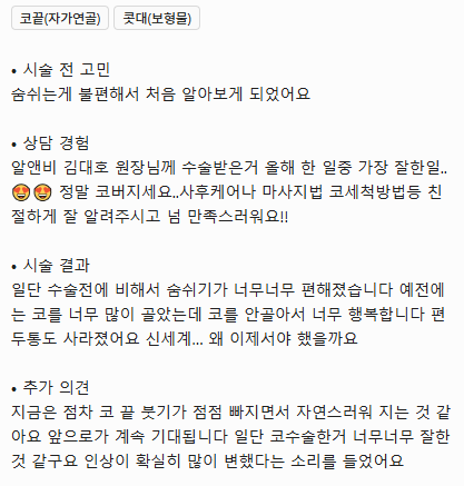 일단 수술 전에 비해서 숨쉬기가 너무너무 편해졌습니다 예전에는 코를 너무 많이 골았는데 코를 안골아서 너무 행복합니다 편두통도 사라졌어요 신세계… 왜 이제서야 했을까요