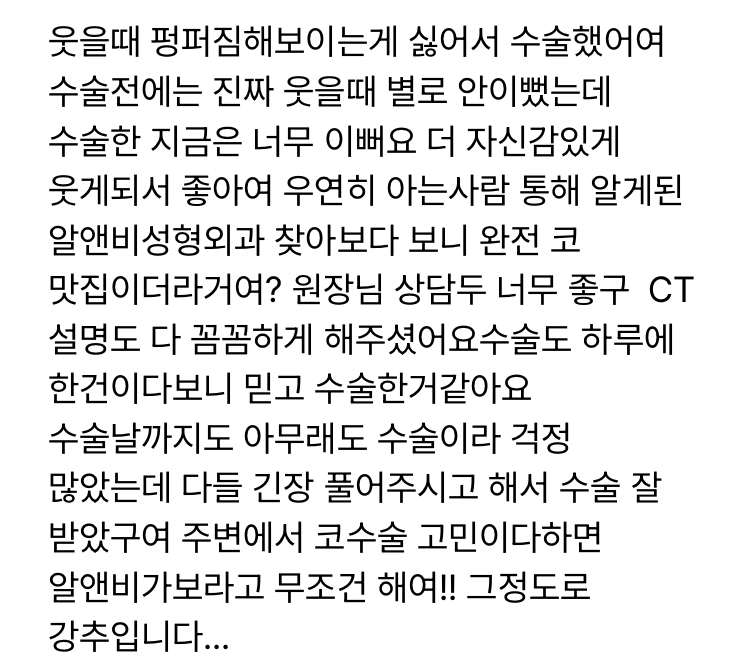 웃을때 펑퍼짐해보이는게 싫어서 수술했어여 수술전에는 진짜 웃을때 별로 안이뻤는데 수술한 지금은 너무 이뻐요 더 자신감있게 웃게되서 좋아여 우연히 아는사람 통해 알게된 알앤비성형외과 찾아보다 보니 완전 코 맛집이더라거여? 원장님 상담두 너무 좋구 CT