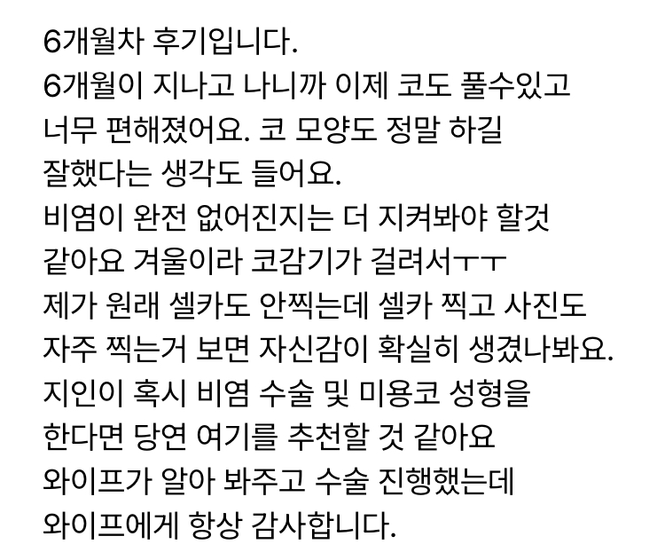 6개월이 지나고 나니까 이제 코도 풀수있고 너무 편해졌어요. 코 모양도 정말 하길 잘했다는 생각도 들어요.