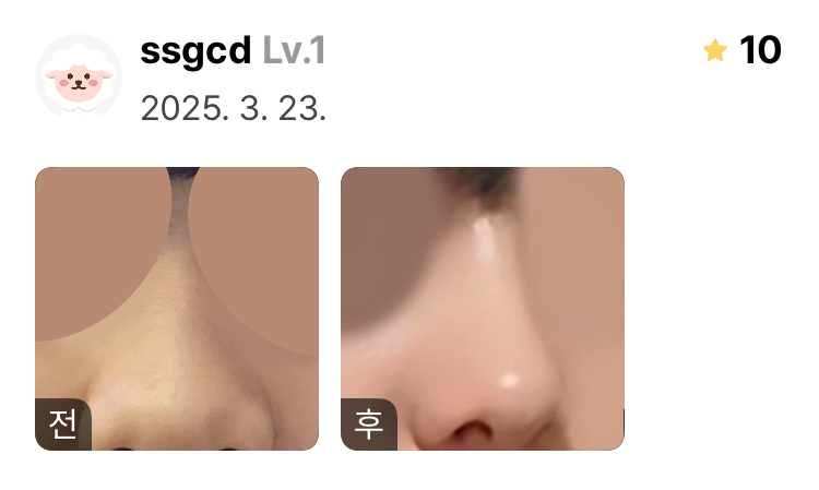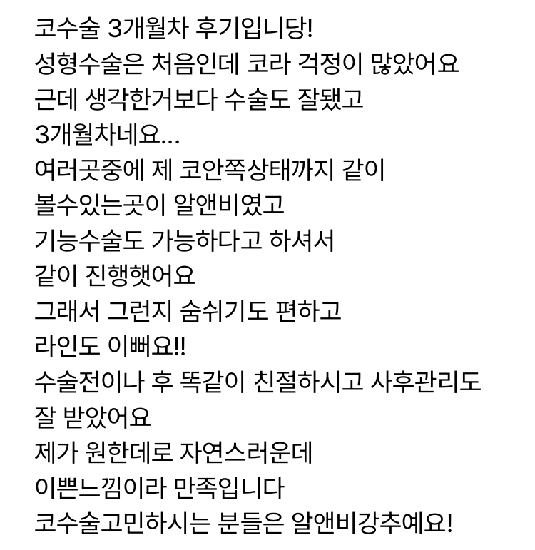 제가 원한데로 자연스러운데 이쁜느낌이라 만족입니다 코수술고민하시는 분들은 알앤비강추예요!