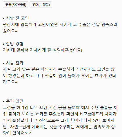 • 시술 전 고민 평상시에 입툭튀가 고민이었던 저에게 코 수술은 정말 만족스러웠어요~ • 상담 경험 저한테 맞춰서 자세하게 잘 설명해주셨어요! • 시술 결과 사실 코가 낮은 편은 아닌지라 수술하기 직전까지도 고민을 많이 했었는데 하고 나니 확실히 입이 들어가 보이는 효과가 있더라구요~ • 추가 의견 교정을 하기엔 너무 오랜 시간 공을 들여야 해서 주변 볼륨을 채워 들어가 보이는 효과를 주었는데 확실히 비포&애프터 차이가 커서 놀랬답니다! 사진상으로는 크게 차이가 나지 않아 보이지만.. 자연스럽게 예뻐지는 것을 추구하는 저에게는 만족도가 상당이 컸어요^_^
