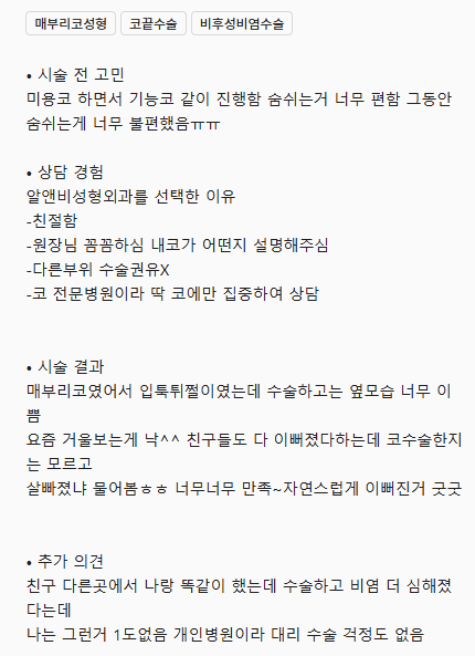 • 시술 전 고민 미용코 하면서 기능코 같이 진행함 숨쉬는거 너무 편함 그동안 숨쉬는게 너무 불편했음ㅠㅠ • 상담 경험 알앤비성형외과를 선택한 이유 -친절함 -원장님 꼼꼼하심 내코가 어떤지 설명해주심 -다른부위 수술권유X -코 전문병원이라 딱 코에만 집중하여 상담 • 시술 결과 매부리코였어서 입툭튀쩔이였는데 수술하고는 옆모습 너무 이쁨 요즘 거울보는게 낙^^ 친구들도 다 이뻐졌다하는데 코수술한지는 모르고 살빠졌냐 물어봄ㅎㅎ 너무너무 만족~자연스럽게 이뻐진거 굿굿 • 추가 의견 친구 다른곳에서 나랑 똑같이 했는데 수술하고 비염 더 심해졌다는데 나는 그런거 1도없음 개인병원이라 대리 수술 걱정도 없음