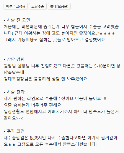 처음에는 비염때문에 숨 쉬는 게 너무 힘들어서 수술을 고려했습니다! 근데 이왕하는 김에 코도 높아지면 좋잖아요..?ㅎㅎㅎㅎ 그래서 기능미용코 잘하는 곳들로 알아보고 결정했어요