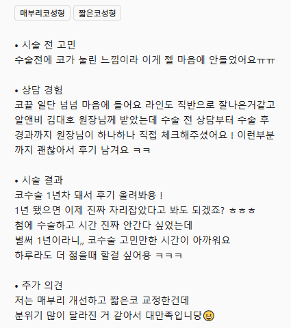 이런부분까지 괜찮아서 후기 남겨요 ㅋㅋ • 시술 결과 코수술 1년차 돼서 후기 올려봐용 ! 1년 됐으면 이제 진짜 자리 잡았다고 봐도 되겠죠? ㅎㅎㅎ 첨에 수술하고 시간 진짜 안 간다 싶었는데 벌써 1년이라니,, 코수술 고민만한 시간이 아까워요 하루라도 더 젊을 때 할 걸 싶어용 ㅋㅋㅋ • 추가 의견 저는 매부리 개선하고 짧은 코 교정한건데 분위기 많이 달라진 거 같아서 대만족입니당