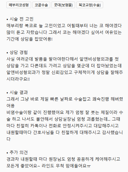 그래서 코는 해야겠다 싶어서 여유있는 기간에 상담을 잡았어용! • 상담 경험 사실 여러군데 발품을 팔아야한다해서 알앤비성형외과를 첫 상담을 가고 다른데도 가려고 상담을 몇군데 더 잡아놨었는데 알앤비성형외과가 정말 신뢰감있고 구체적이게 상담을 잘해주시더라구요!! • 시술 결과 그래서 그냥 바로 제일 빠른 날짜로 수술잡고 쾌속 진행 해버렸어용 비염수술이랑 같이 진행했어요 제가 엄청 잘 붓는 체질이라 수술 하고 나서도 불안해서 상담실장님 엄청 괴롭혔는데... 그때마다 친절히 카톡이나 전화로 안정시켜주시고 대답해주시고 내원할때마다 간호사님들 다 친절하게 대해주시고 감사했습니다 • 추가 의견 경과차 내원할 때 마다 원장님도 엄청 꼼꼼하게 케어해주시고 모든게 좋았어요~ 라인도 무척 맘에들어요ㅠ